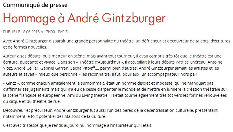 L'objet de ce livre a été à l'origine de publier les carnets de comptes rendus de spectacles et de voyages qu'André Gintzburger (Gintz pour ses vrais amis, André pour ceux qui se disent tels) avait rédigés au jour le jour pendant trente ans, de 1960 à 2000. Il fallait les déchiffrer car ils étaient jetés d'une plume hâtive dans des carnets. C'est donc leur transcription lisible qui est livrée aux lecteurs grâce à l'édition. L'originalité de ces critiques, c'est qu'elles sont liées à des repères personnels. Pendant plus de cinquante ans, André Gintzburger a aidé de nombreuses compagnies théâtrales ou apparentées à se faire connaître à travers le monde. Certains, et non des moindres (tels Antoine Vitez à ses débuts, Jean Luc Courcoult du Le Royal de Luxe, Bartabas de Zingaro, Pierrot Bidon d'Archaos!) ont vu en lui un passeur. Toujours à la recherche de nouveaux talents, la boutade d'Eugène Ionesco fut tout au long de sa vie comme une devise : " L'avant-garde, c'est ce qui marche en avant du gros des troupes ". Il a semblé nécessaire à l'auteur que les gens fassent connaissance avec l'homme qui a vécu les trois-quart du XXe siècle et déjà une décennie du XXIe à la recherche à travers le " théâtre " de lendemains qui seraient meilleurs. Ce fut pour lui, il ne le cache pas, un long parcours de rêves et de déceptions, avec souvent beaucoup d'indifférence, de la curiosité parfois. Ce choix du " théâtre " comme repère en serait il responsable ? Cet art fut il vraiment " le reflet des temps ? ".