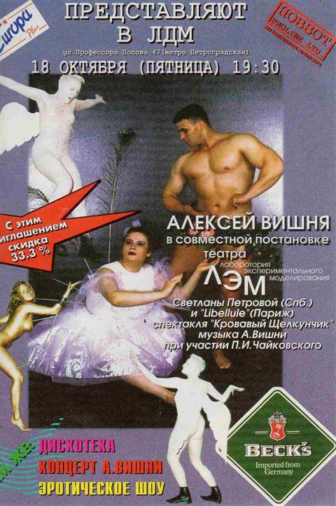 La même année, direction Saint-Pétersbourg où elle coproduit un spectacle du L.E.M. (Laboratoire Expérimental de Mode) : Casse-noisette assassiné, de Svetlana PETROVNA. Elle y joue le rôle d’une danseuse classique en pleine déchéance et apprends phonétiquement un monologue en russe !