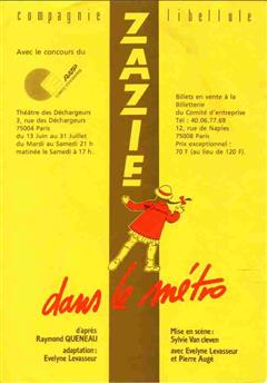 Et en 1987, elle écrit une adaptation pour deux comédiens de Zazie dans le Métro, d’après le roman de Raymond QUENEAU, et crée la compagnie LIBELLULE. Elle interprète le rôle titre et s’entoure des compétences du comédien Pierre AUGE (disparu brutalement en 2002), Sylvie VAN CLEVEN (metteur en scène) Hervé DUVEL (créateur lumière et régisseur), Christophe DEJEAN et Marc LE HENE (compositeurs/musiciens).
