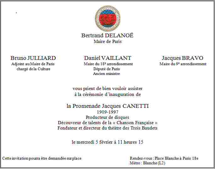 C’est en face du Théâtre des Trois Baudets qu’il avait crée fin 1947 qu'est inaugurée (en musique) la Promenade Jacques Canetti.